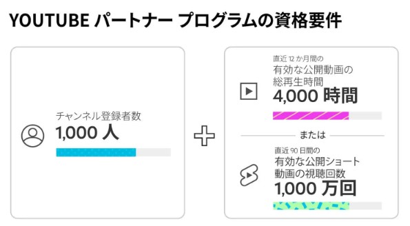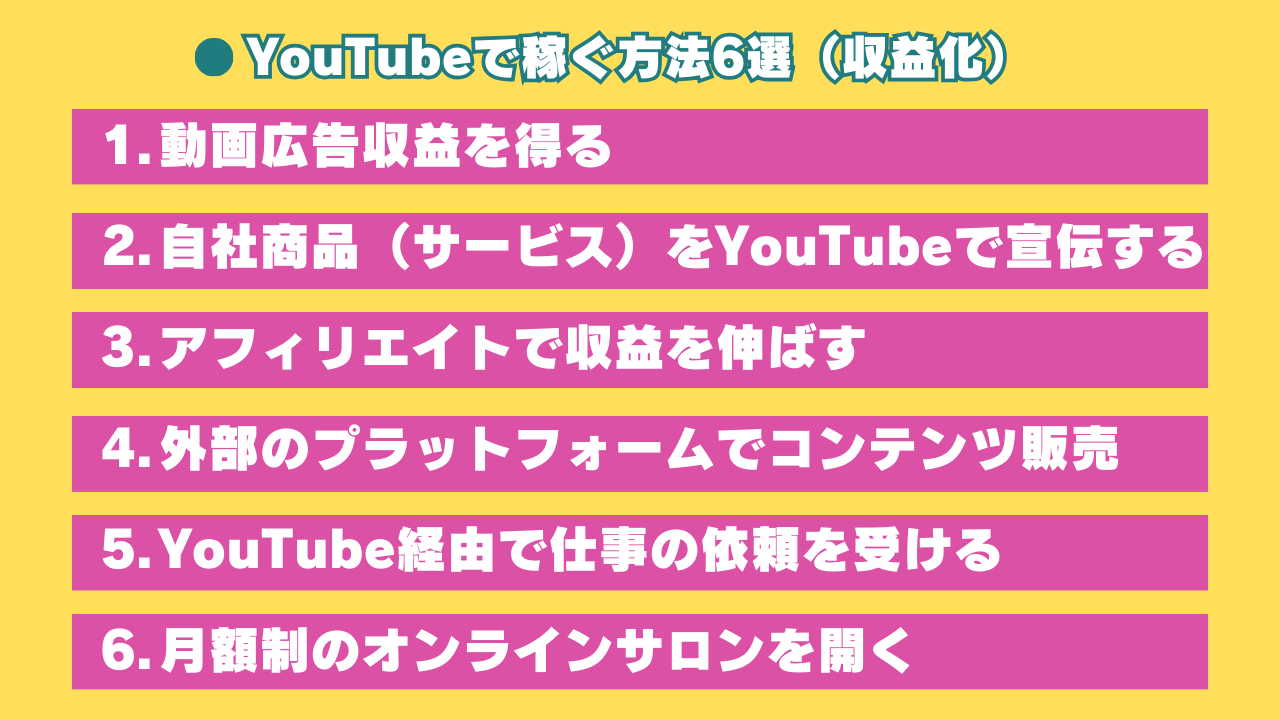 動画広告収益を得るには「チャンネル登録者1000人」を達成し、かつ「過去12ヶ月の動画総再生時間が4000時間」または「ショート動画の視聴回数1,000万回」どちらかのの条件クリアが必要になりますが、2から6までの方法はすぐにでも始めることができます。