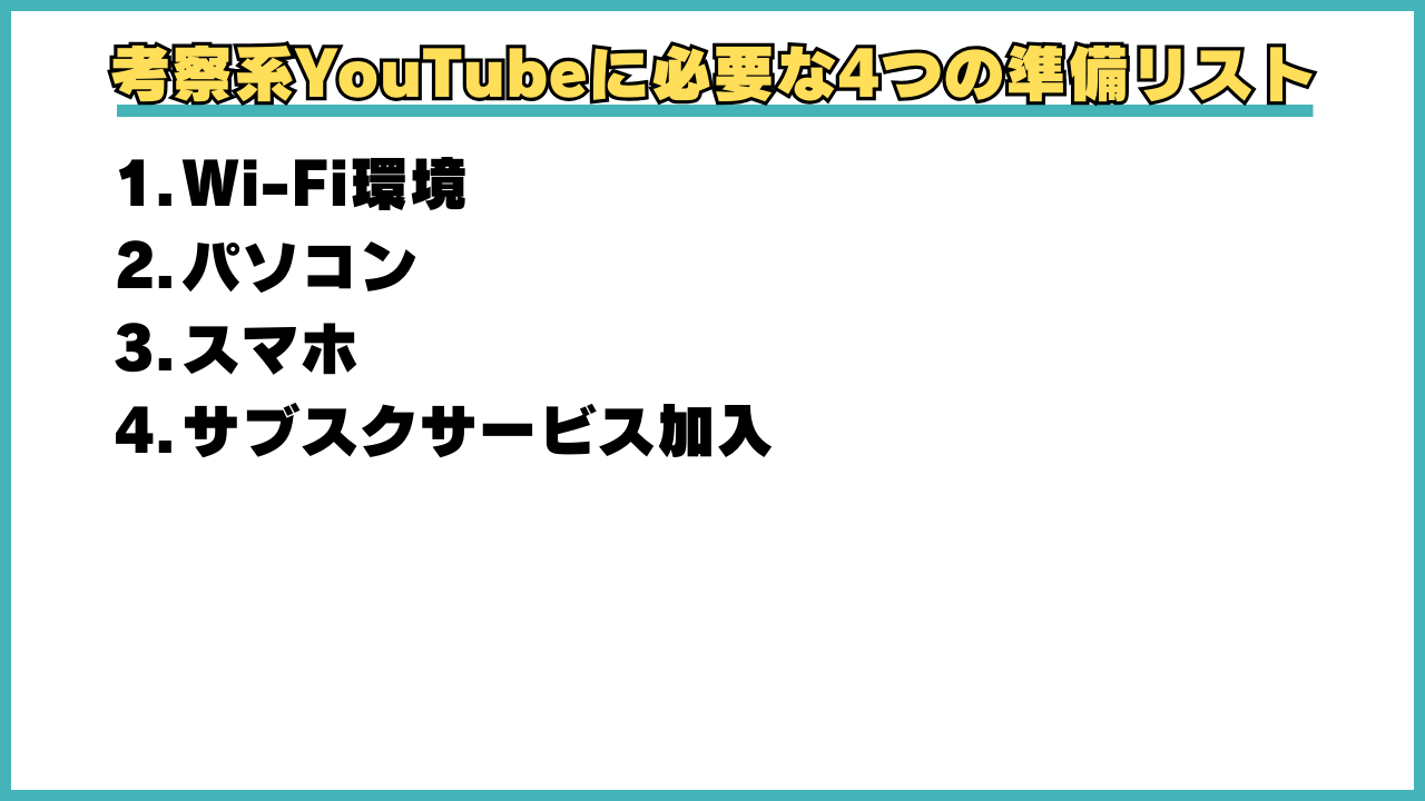 まず、YouTube運営に必要なリストは、「1.Wi-Fi環境」「2.パソコン」「3.スマホ」「4.サブスクサービス」の4つです。