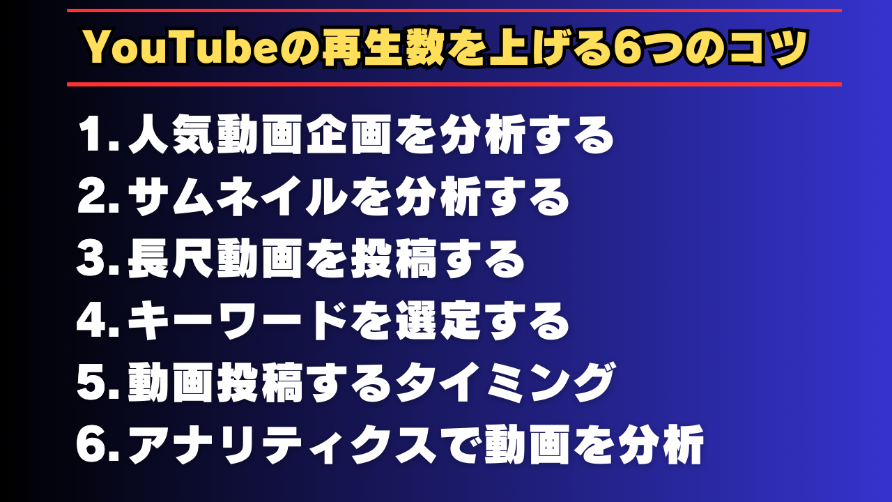 YouTubeで再生を上げるコツは、こちらの6点がポイントです。