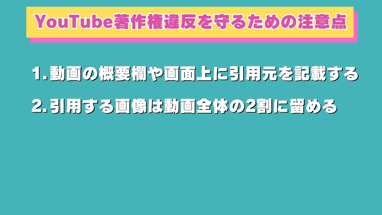 考察系動画を投稿する際は、「1.引用元の記載」「2.引用素材は全体の2割に留める」ルールを守り、著作権違反とならないよう注意しましょう。